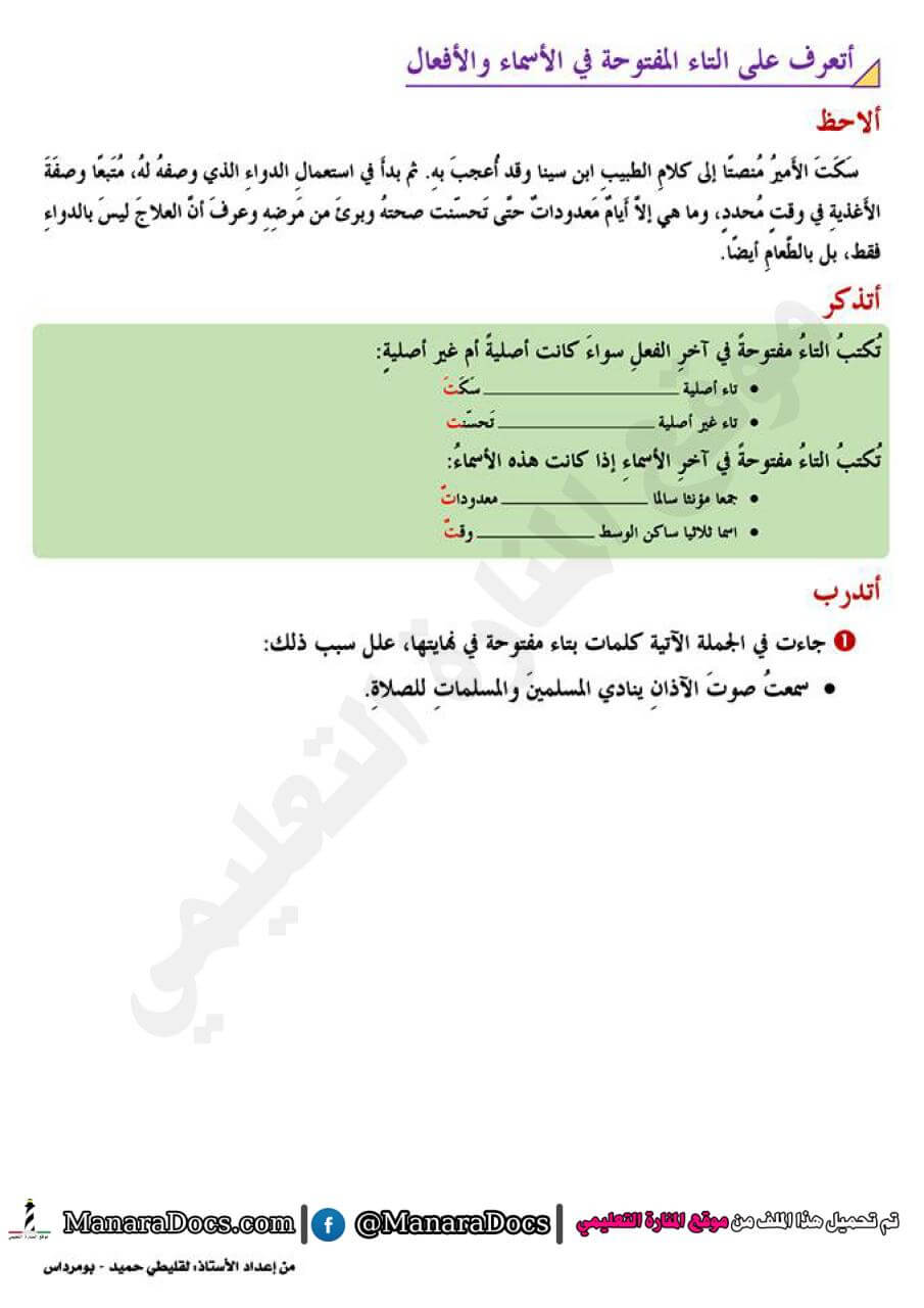 أنشطة درس التاء المفتوحة في الافعال الموافق لنص ابن سينا الطبيب الماهر للغة العربية للسنة الخامسة المكيفة مع الجيل الثاني