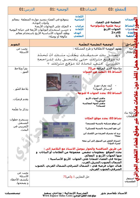 مذكرة درس الجهات الأربع المقطع الثالث في التربية العلمية للسنة الرابعة ابتدائي