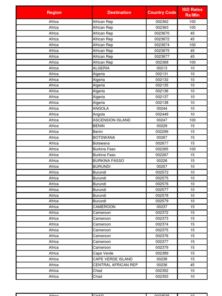 Region Destination Country Code Isd Rates Rs Min Ivory Coast Africa